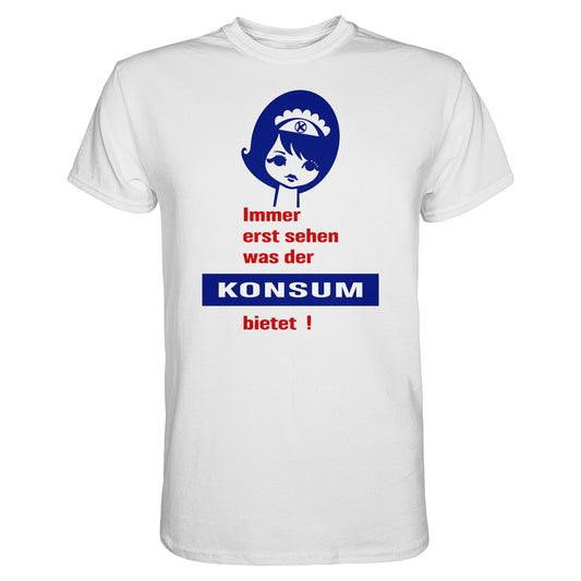 DDR Ostalgie Shirt Unisex • IMMER ERST SEHEN, WAS DER KONSUM BIETET! - ORIGINAL ILLUSTRATION